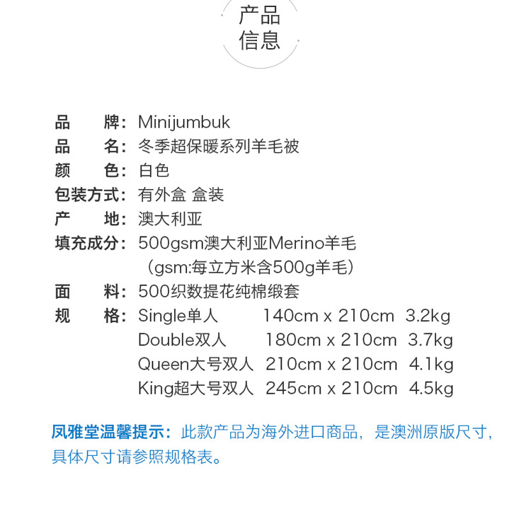 澳洲直邮 Minijumbuk Warm 厚款羊毛被 皇后210cm x 210cm