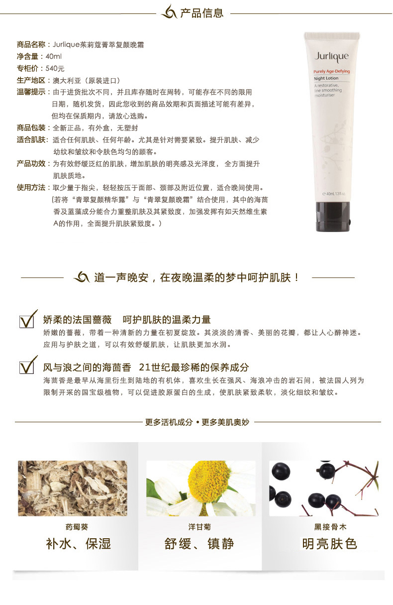 特价促销 保质期 2020年2月 Jurlique 茱莉蔻 菁萃复颜晚霜 40ml