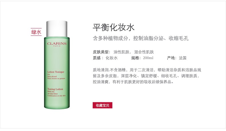 Clarins 娇韵诗 平衡柔肤水化妆水200ml控油保湿收缩毛孔绿水